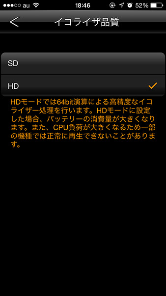 イコライザ品質の設定。どうせ使うなら「HD」にしたい気がしてならないところだがバッテリーが…