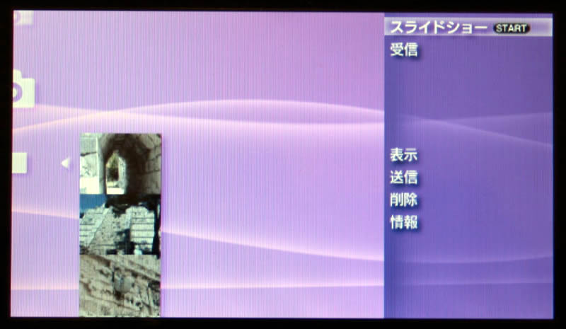 HOME > レビュー > レビュー記事一覧 マルチメディアプレーヤーとしての実力はいかに!? 【一条真人のPSP再入門講座】第1回:「PSP-3000」登場前にPSPのAV機能をマスターする 一条真人 2008年09月24日 前の写真へ 次の写真へ 目的の画像フォルダでオプションメニューからスライドショーを実行する 前の写真へ 次の写真へ この写真の記事へ 関連リンク PSPの製品詳細
