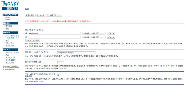 (6)左メニュー「共有」を開き、「コンテンツディレクトリ」で共有されるフォルダを確認&設定。この場合はNAS内の「Multimedia」フォルダの中の音源が配信されることになる