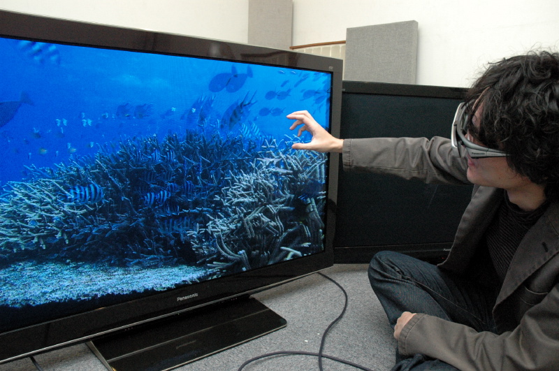 明るい部屋で3D映像を視聴。思わず手を伸ばしたくなるリアリティーがある、と折原氏