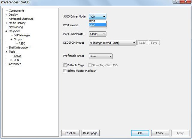 (19)ウィンドウ右ツリーから「Tools」→「SACD」と選択。Asio Driver ModeからDSDを選ぶ