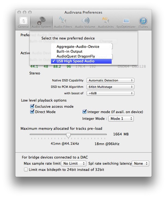 最上段のPreferred Audio Deviceから「USB High Speed Audio」を選択