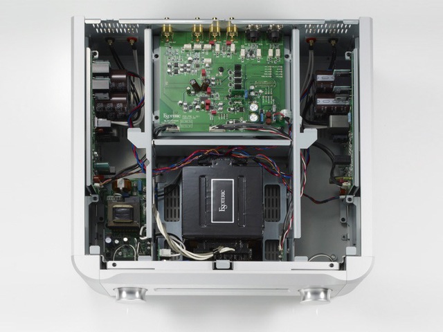 I-03の内部構造。各回路ブロックを専用のコンパートメントに収めて立体配置することで、回路の相互干渉を最小化、信号経路の最短化を実現する「3D オプティマイズド シャーシ構造」を採用。内部シャーシは5分割構造で、各chに分離した2枚のプリアンプ基板は背面端子に最も近い専用コンパートメントにマウントする。プリアンプから最短経路で接続された2台のEsoteric MSWパワーアンプ・ロックはシャーシの左右の専用コンパートメントに配置され、アルミブロックを介して左右のサイドパネルにマウント。サイドパネルをヒートシンクとして使うことにより、効率的な放熱が可能となっている