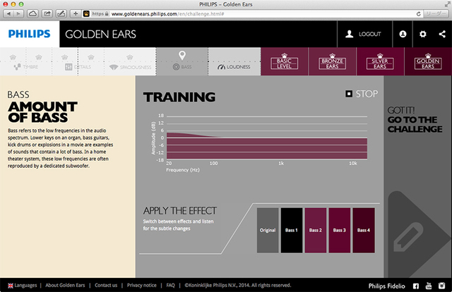 トレーニングはオリジナル音源と前述の周波数帯域を4段階で盛り上げたサンプルの聴き分け。チャレンジはいつものABC3択