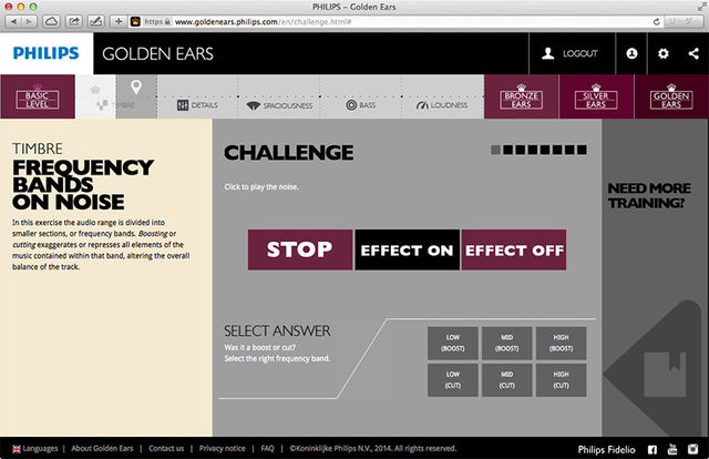 ブロンズのFREQUENCY BANDS OF NOISE。全帯域フラットのホワイトノイズに低・中・高域のブーストもしくはカットを施し、それをその6択で当てる