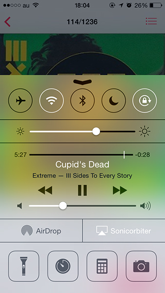 音楽再生中にコントロールセンターを呼び出し、そのAirPlayメニューからsMS-100(Sonicorbiter)を選択