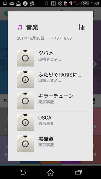 音楽のアイコンをタップするとその時間に再生した楽曲がリストになる