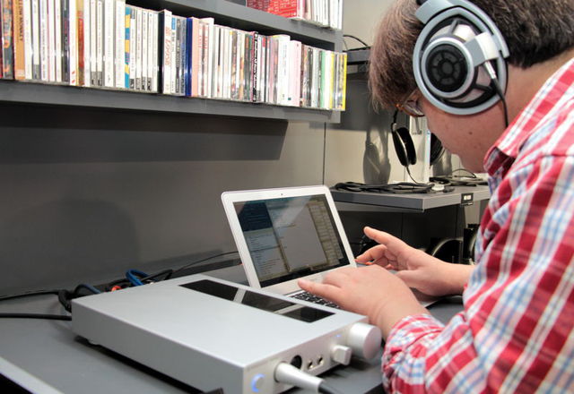 「HD800」のサウンドをヘッドホンアンプ「HDVD800」と組み合わせて試聴し、確かめる野村氏
