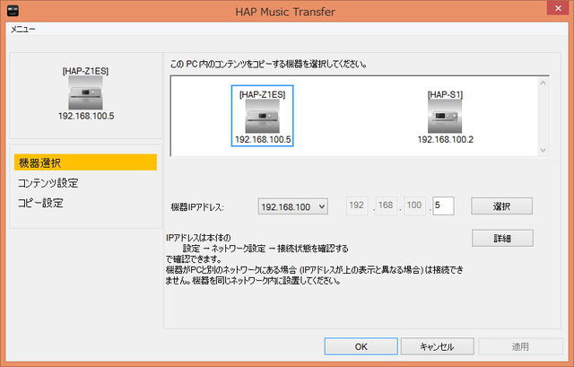 PC用アプリ「HAP Music Transfer」もアップデート。機器のIPアドレスを直接打ち込み、データコピー先として指定することが可能になった