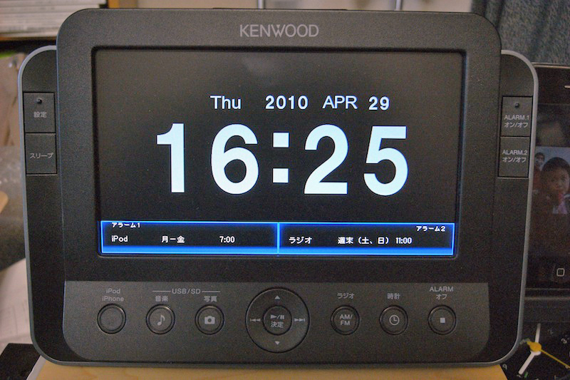 見やすい時刻表示。好きな写真を背景にすることもできる。アラームは2系統設定可能なので平日は7時起き、週末はのんびり11時起きといった使い方もできる