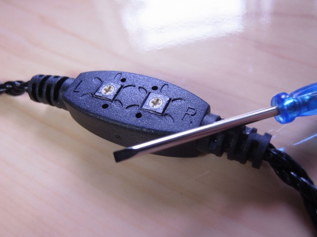 ケーブルに設けられたユニットのダイヤルを付属のドライバーで調整する。左右の調整はなぜか別々のダイヤル