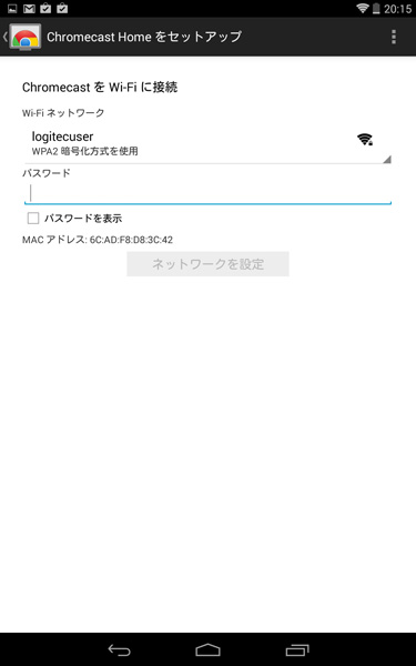 ホームネットワークのアクセスポイントを選択してパスワードを入力