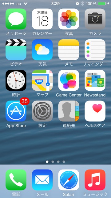 iOS 8のホーム画面。デザイン的にはiOS 7とほぼ同じだが、歩数測定などに使えるアプリ「ヘルスケア」が追加されているほか、「時計」のアイコンデザインが変化していることがわかる