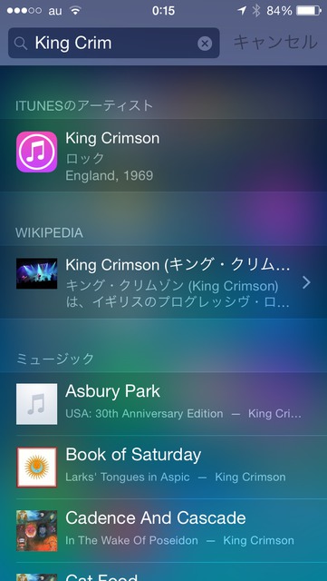 Spotlightで「King Crimson」を検索しようとしたところ、「King Crim」まで入力したところでiTunes Storeの情報がヒットした