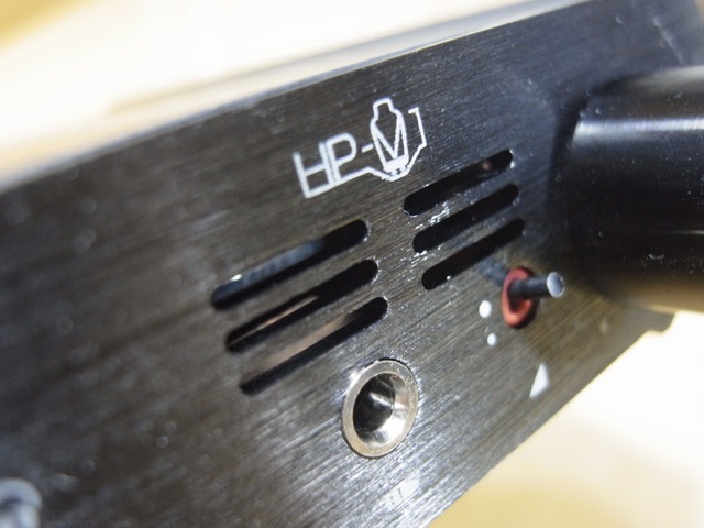 フロントのアップ。いい感じに荒いヘアライン仕上げ。スリットは真空管の放熱のためか