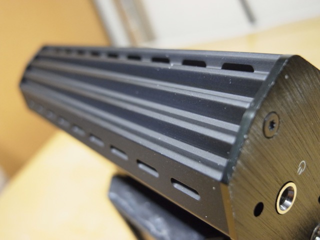 サイド。フロントとリアの他は艶消し仕上げ。放熱フィンを思わせる造形で、ここにも放熱孔らしきものが