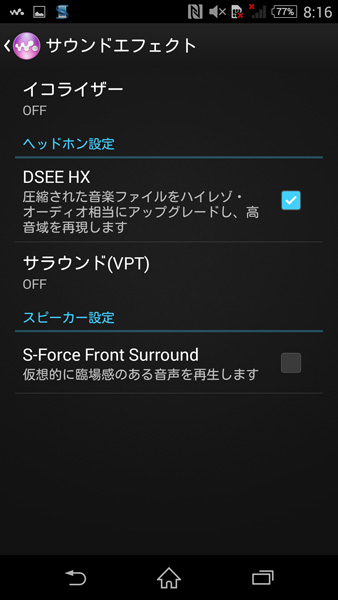 サウンドエフェクトのメニュー内に「DSEE HX」の設定項目がある