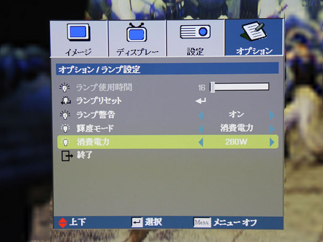 オプション/ランプ設定画面。輝度モードや消費電力を調整できる