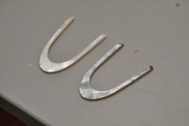 Edition 8 Juliaのインレイ。木製の本体に薄く加工した貝を、一つずつ色味を確認しながら貼り付ける。最終的にハウジングの高さに調節しながら、薄い木の本体を丁寧にヤスリ掛けして高さを合わせる。エッジの部分には柔らかな丸みを付けている