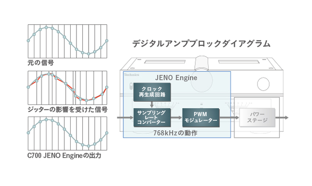 フルデジタルアンプ「JENO Engine」を搭載。ノイズやジッターの影響を受けずに増幅が行える