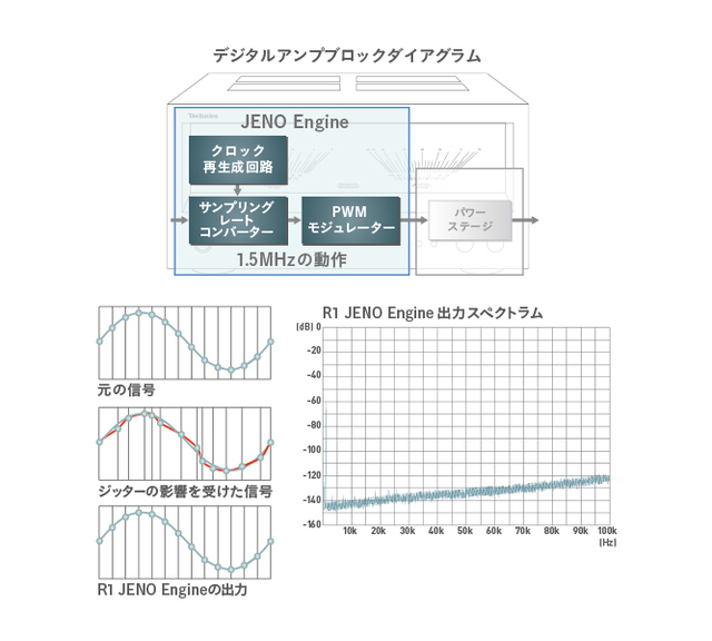 SE-R1は、高精度なジッター削減回路とPWM変換回路を含むフルデジタルアンプ「JENO Engine」を搭載する