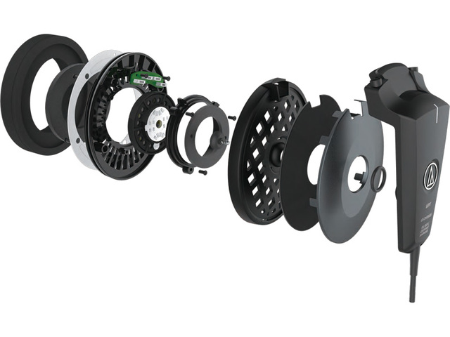 ヘッドホンの内部構造。左から5番目のレイヤー、小さめのサークル状のパーツが53mm口径のドライバーとマルチボイスコイルになる