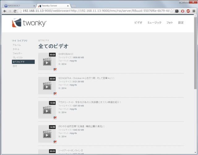 「TwonkyMedia DTCP」の設定画面には特別な設定は不要。ダビング済みの番組もPC上から確認できるが、著作権保護の暗号化が行われているため再生は不可