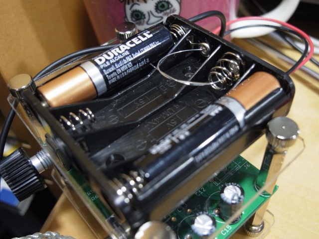 電池ボックスのこの部分を直結することで電池2本分をジャンプ。エレキギターの弦を半田付けも何もせず穴に通して結んだだけ