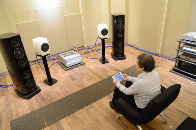 パナソニックセンター東京のテクニクス リスニングルームで試聴を行う山之内氏