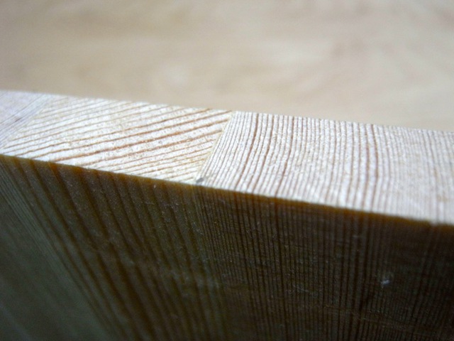 こちらはパインのピース材の木口面で、左が追柾目、右が柾目。木目が斜めに走っているのが追柾目、垂直に並んでいるのが柾目