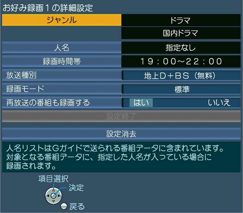 「お好み録画」機能で指定した好みのジャンルの番組をテレビが自動録画してくれる機能も搭載する