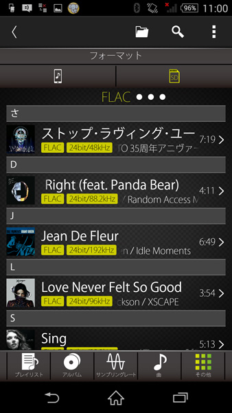 曲一覧には、ファイル形式はもちろんビットレート/サンプリングレートも表示。音源についての情報を把握しやすく便利だ。FLACやWAVなどフォーマットごとにソートもできる