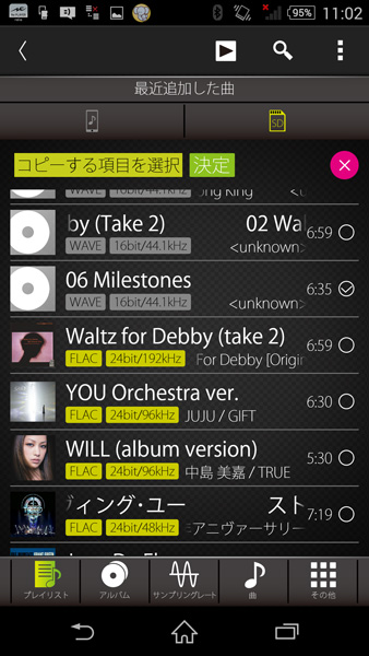 SDカード→内蔵メモリーへの楽曲ファイルのコピーがアプリからの操作でできる