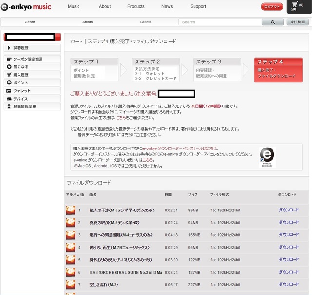 購入手続きが完了したところ。画面下の「ファイルダウンロード」から、1曲1曲手動でダウンロードすることもできる