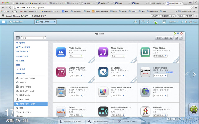 (2)左カラムから「エンターテインメント」を選ぶと該当するアプリの一覧が表示されるので、「e-onkyo music」を選び「QTSに追加」をクリック