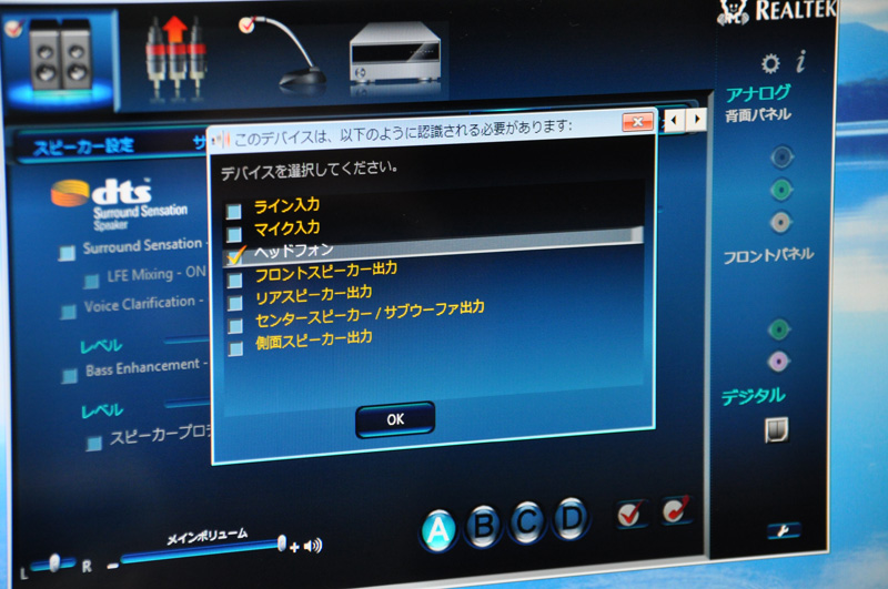 ヘッドホンを接続するとデバイスの確認画面が立ち上がる