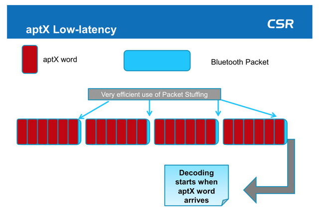 aptXでは、小さいデータに分割してデータを伝送。受信したデータを順次デコードするため遅延が低い