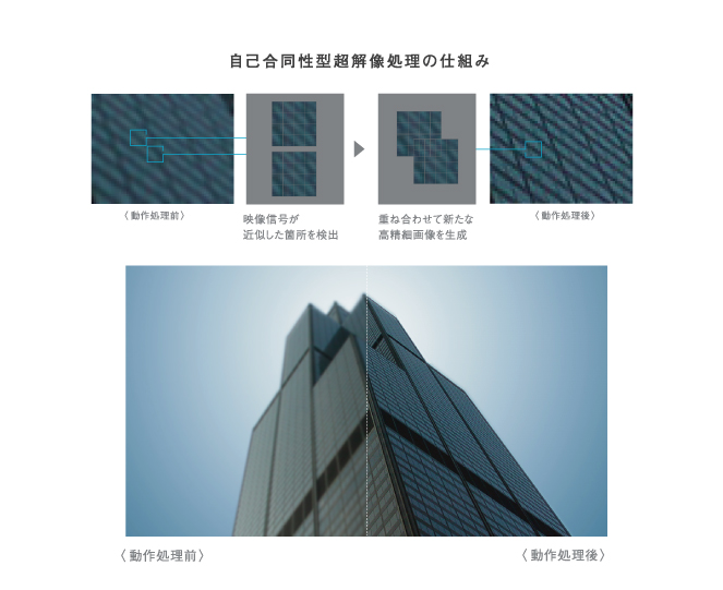 画像の自己合同性のある部分(似た画像)を選択し抽出する「自己合同性型超解像技術」を搭載する