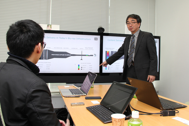 筆者にドルビービジョンの解説をする真野氏
