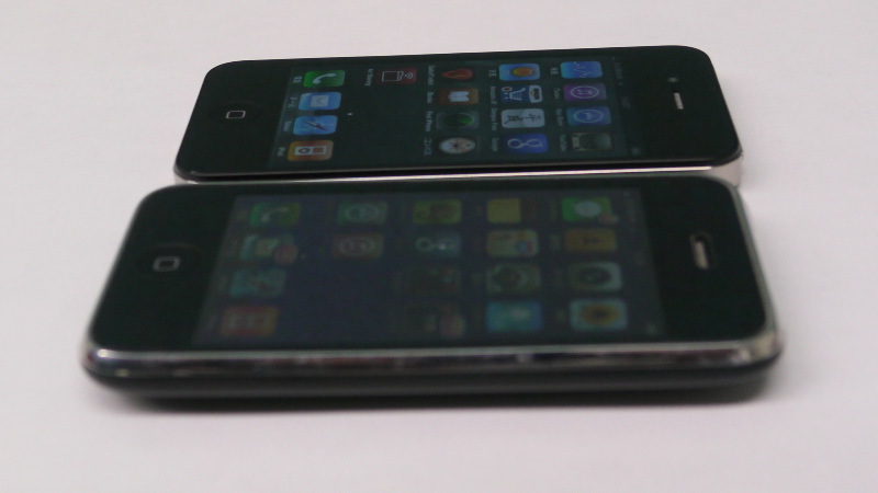 横方向から比較撮影。奥がiPhone 4。コントラスト、輝度ともに低下が抑えられている