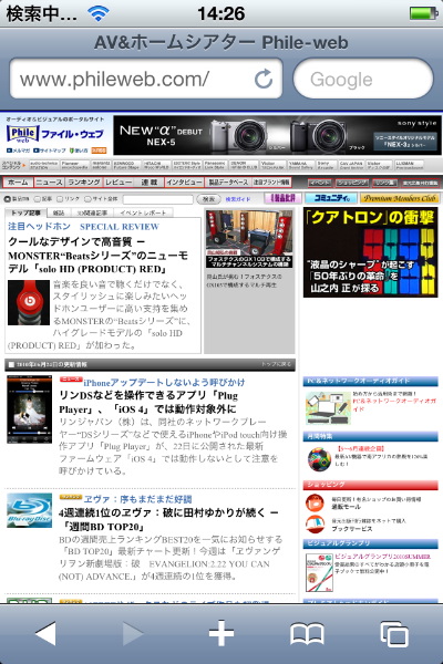 iPhone 4でのSafari表示画面。写真をクリックして拡大するとiPhone 4の細密な表示性能がお分かり頂けるはずだ