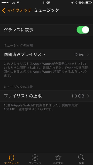 iPhone上にあるプレイリストと同期すれば、Apple Watchに曲が転送される(充電時のみ実行)。上限の2GBを多いと見るか少ないと見るか?