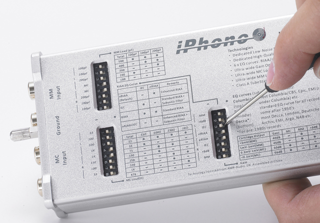 iPhonoは底面のディップスイッチでゲインやロードインピーダンスを設定が可能。設定の際に便利なマイナスドライバーも付属する