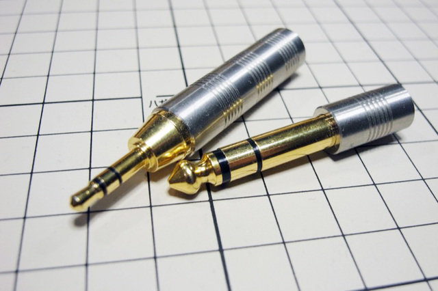 手前が3.5mm→6.35mm、奥が6.35mm→3.5mm。共にFURUTECHの高品質プラグ