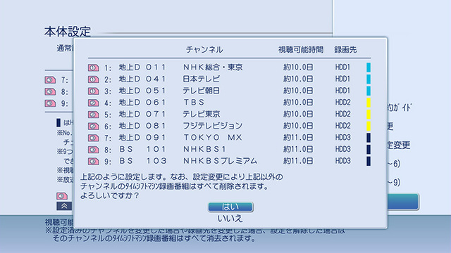 東芝M590の設定画面。最大9chのすべてでBSを登録可能。録画モードは1〜6は「AVC中画質」、通常録画からの追加分にあたる7〜9は、HDDの75%(最大値は87.5%、2.62TB)を割り当て「AVC低画質」を指定