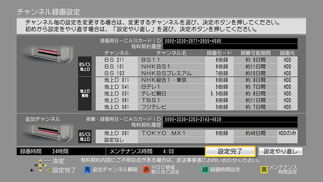 パナソニックBRX6000の設定画面。一番下の「追加チャンネル」は最大2ch追加可能で、今回は3TBの通常録画用HDDから2TBを登録(最大2.75TB)