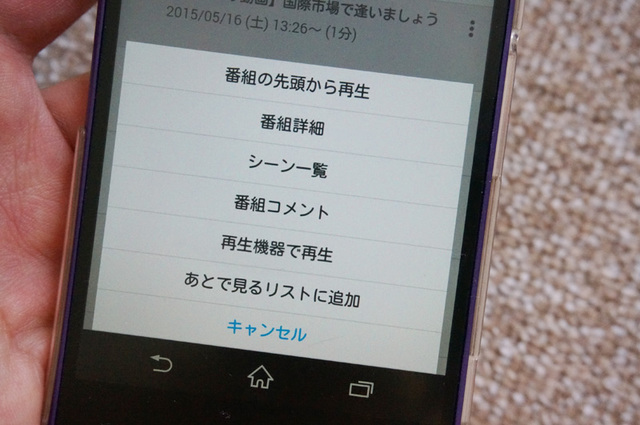 録画リストの右にある「…」を縦に並べたようなアイコンをタップすると「シーン一覧」を含む再生メニューが表れる