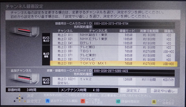 「チャンネル録画」の設定画面。全録専用に設けられた8基のチューナーに、2基までの追加チャンネルが選べる