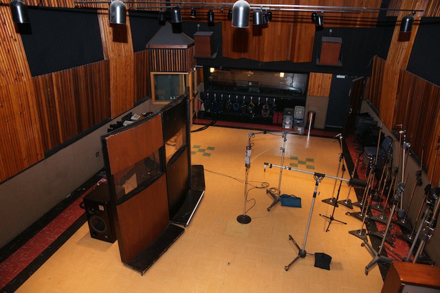 “スタジオ2”メインブースにおける“リアンプ”の様子。画面左側に設置されたアクティブスピーカーの音をスタジオに響かせ、中央にあるリボンマイクで残響ごと収音する