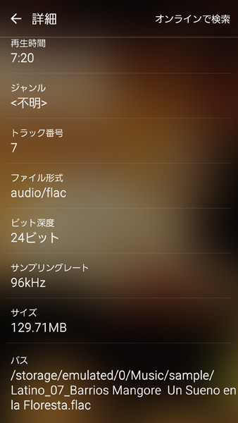 ハイレゾファイルはサンプリング周波数やビットレートなど詳細を確認できる